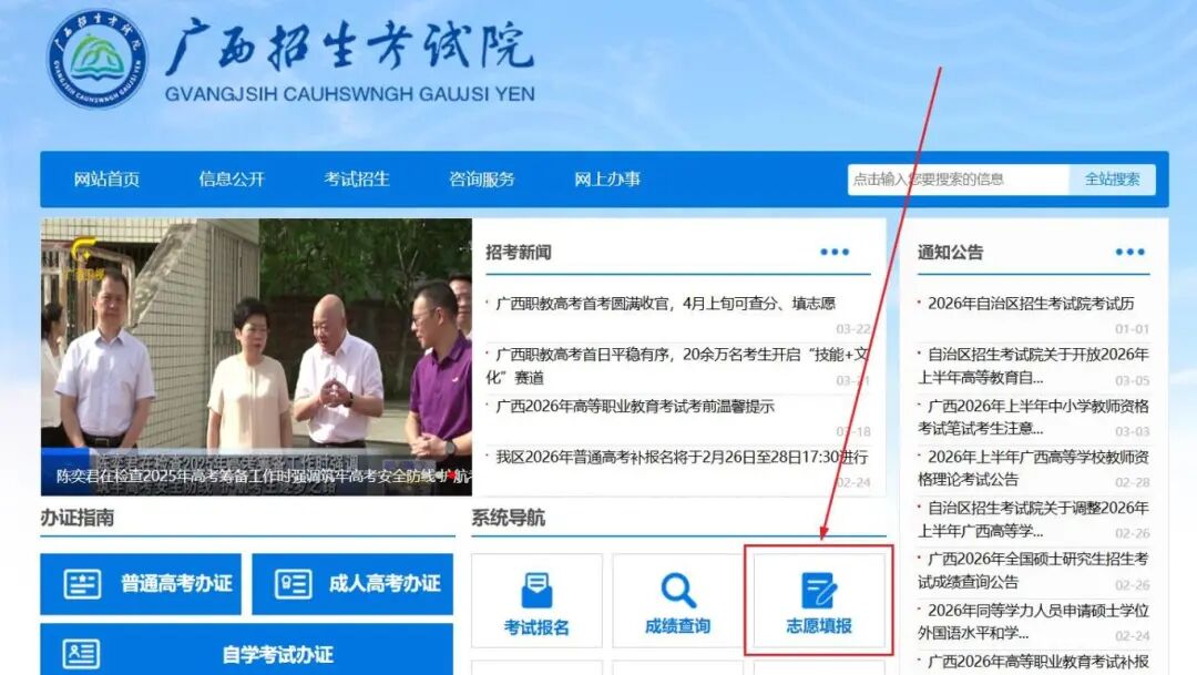 一、考生使用电脑浏览器登录“广西招生考试院”网站(网址:https://www.gxeea.cn),点击首页【系统导航】中的【志愿填报】。