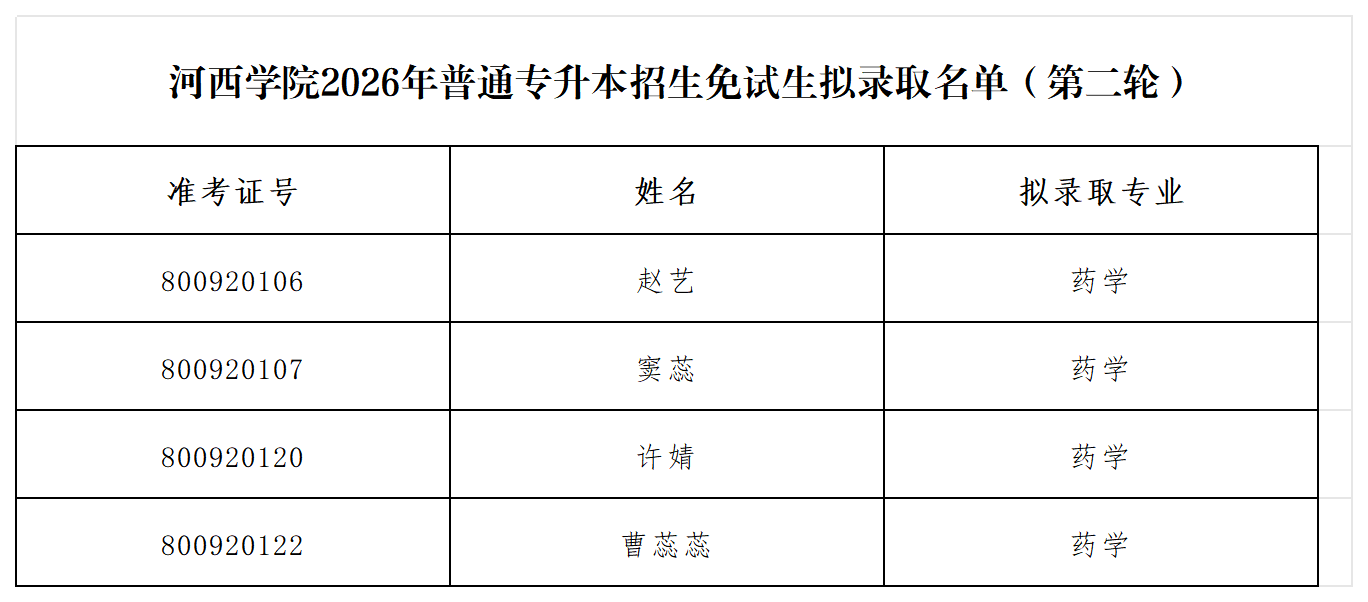 河西学院2026年甘肃省普通专升本免试招生专业能力测试及录取(第二轮)工作现已结束,现将拟录取名单予以公示,公示期为2026年3月23日-3月25日。各位考生可通过河西学院智慧招生微信小程序“成绩查询”栏查询测试成绩(先点击下方“个人中心”登录再查询);若对成绩有异议,请联系河西学院教务处,联系电话:0936-8282027。各位考生如对拟录取结果有异议,请在公示期内联系河西学院招生办,联系电话:0936-8283598。过期不再受理相关异议。