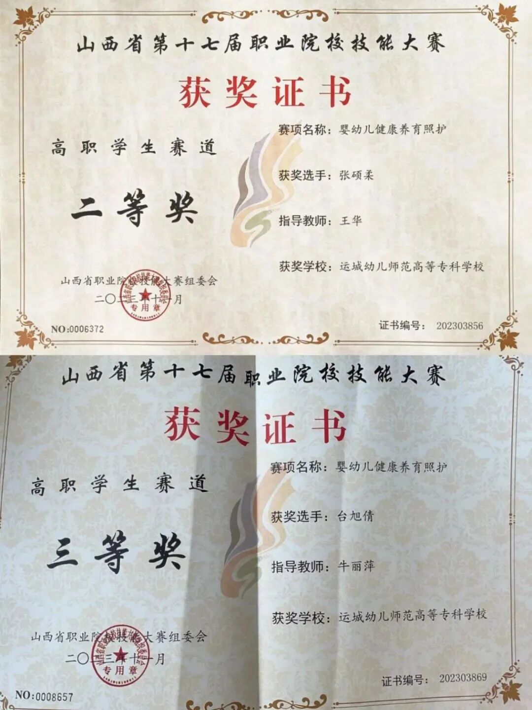 2023年在山西省第十七届职业院校技能大赛婴幼儿健康养育照护赛项中,婴幼儿托育服务与管理专业学生获得个人二、三等奖。