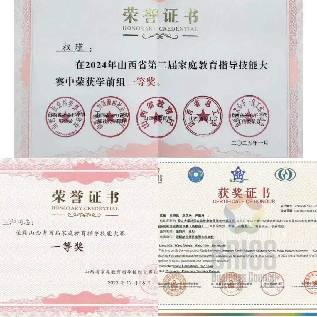 2024年在“一带一路暨金砖国家技能发展与技术创新大赛首届家庭服务创新创业赛项”决赛中获一等奖。在山西省家庭教育指导技能大赛中连续两届荣获团体一等奖、个人一等奖和个人二等奖。