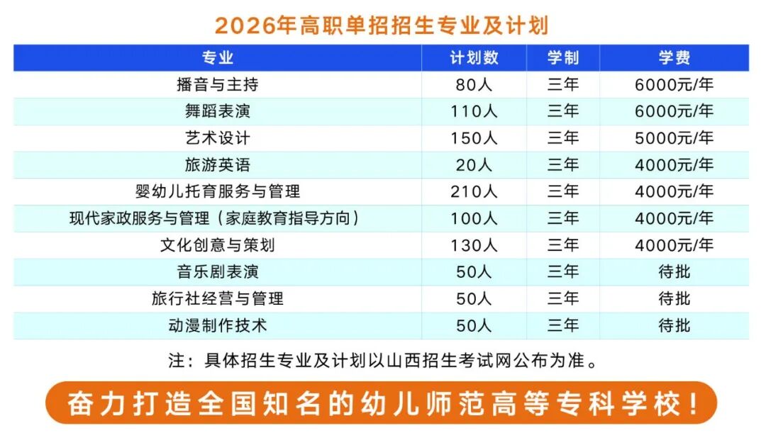 学校师资力量雄厚,办学条件优越,单招各专业人才培养成绩斐然。播音与主持专业学生先后荣获全国第六届大学生艺术展演活动一等奖、全国第七届大学生艺术展演活动三等奖,多次获得山西省大学生艺术展演活动一等奖;在第二届中华经典诵写讲大赛中获得大学生组优秀奖。旅游英语专业学生在山西省职业院校技能大赛中多次荣获二等奖、三等奖。舞蹈表演专业学生荣获全国第七届大学生艺术展演活动二等奖,多次在“山西省大学生艺术展演”“山西省职业院校艺术专业技能大赛-中国舞项目”“山西省大学生学生运动舞蹈联赛”“山西省大学生舞蹈锦标赛”“山西省雏菊奖”学生艺术大赛等比赛中获一等奖。艺术设计专业学生在全国大学生艺术展演活动中荣获二等奖,在2020ACA世界大赛中国赛区山西分赛区荣获优秀奖,在“山西邮政杯”书信文化设计大赛中荣获一等奖。婴幼儿托育服务与管理专业学生在全国托育职业技能竞赛决赛中荣获团体二等奖,在山西省职业院校技能大赛婴幼儿健康养育照护赛项中多次获奖。现代家政服务与管理(家庭教育指导方向)是国家紧缺、新兴专业,在2024一带一路暨金砖国家创新技能大赛家庭服务大赛中获得金奖(一等奖),连续两年获得山西省家庭教育指导大赛团体一等奖和个人一等奖。动漫制作技术专业是国家数字创意产业核心板块,人才缺口巨大,就业前景广阔。旅行社经营与管理专业,聚焦研学与定制旅行,培养擅设计、精策划,高素质文旅技能人才。音乐剧表演专业深耕音乐剧表演,唱跳演全能培养,让青春在舞台中央闪耀光芒。