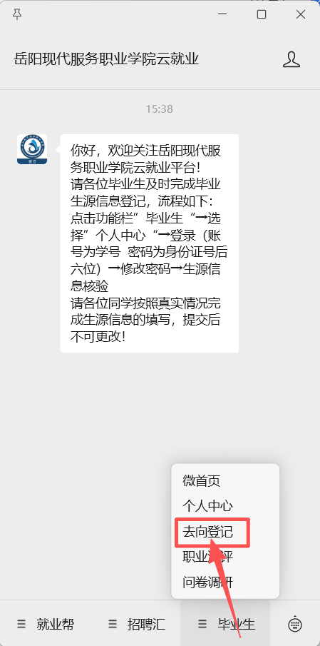 学生用微信搜索“岳阳现代服务职业学院云就业”微信公众号点关注,然后点【毕业生】-【去向登记】进入就业信息进行登记(未登录账号的学生需要登--学号+身份证后六位密码),进入就业信息填报页面。学生根据就业信息填报页面的字段详情填写就业信息,填写完成后,点击提交即可完成就业信息填报。