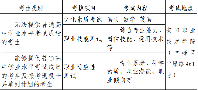 凡获得由省级招委会确定的统测项目范围内的国家二级运动员以上称号的考生,或符合“2026年单招考试职业技能比赛奖项清单”中获奖赛项之一的考生,可在规定时间内填写《安阳职业技术学院2026年优秀技能人才赋分申请表》(详见附件1),提出赋分申请,由考生所在学校负责确认考生获奖情况。