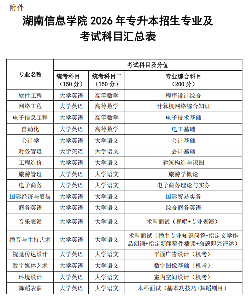 附件:湖南信息学院2026年专升本招生专业及考试科目汇总表