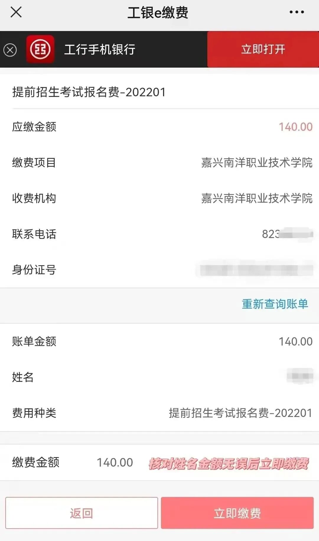 3.核对系统显示的身份证号、姓名以及缴费金额,确认无误后点击“立即缴费”