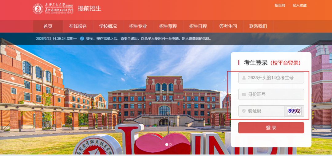 1.进入嘉兴南洋职业技术学院高职提前招生网 https://tqzsny.eduw.cn/,输入高考考生号(2633开头的14位考生号)及身份证号