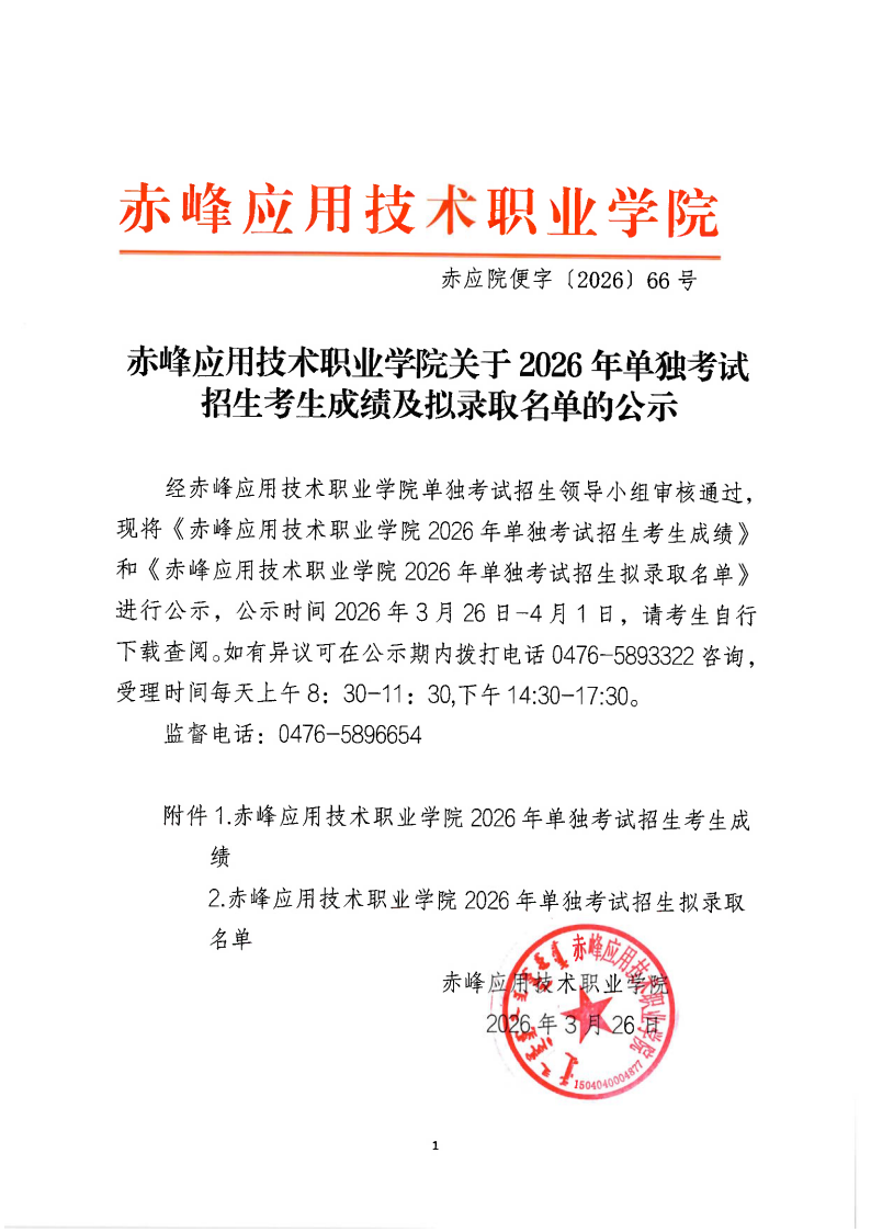 赤峰应用技术职业学院2026年单独考试招生拟录取名单.pdf