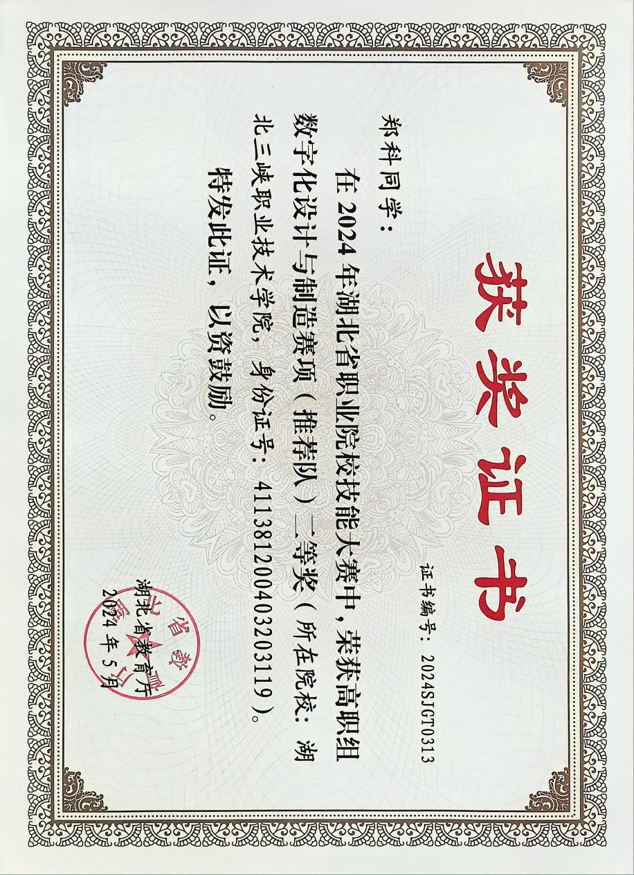 12 | 2024年 | 湖北省职业院校职业技能大赛数字化设计与制造赛项教师个人全能赛二等奖推荐队 | 省级 | 二等奖 | 郑科 |