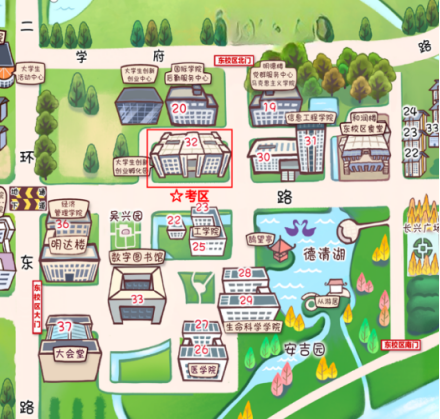 考生应于3月28日12:30-13:30在湖州师范大学东校区32幢教学楼一楼大厅办理报到。建议考生从东校区北门(学府路)进校。