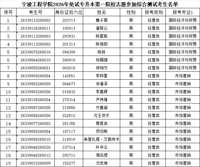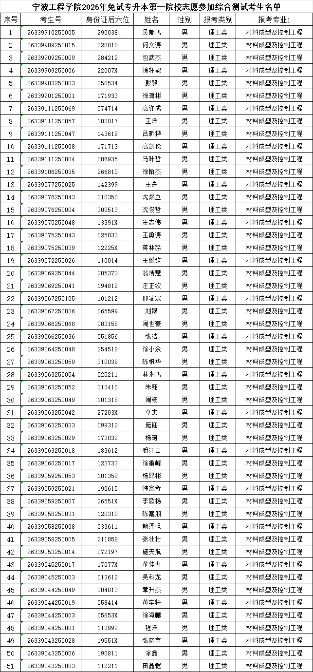 第一专业志愿报考理工类材料成型及控制工程专业,经管类市场营销和国际经济与贸易专业的人数超过招生计划数,根据《宁波工程学院2026年退役大学生士兵免试专升本招生简章》,考生需要参加本轮综合测试,未按要求参加我校测试的考生视为放弃报考资格,不能进入后续的录取环节。须参加综合测试的考生名单详见附件。