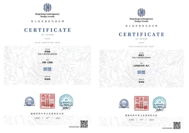 (2)第七届香港当代设计奖由香港美术设计协会主办,以文化传承+数字创新为核心宗旨,是跨区域设计交流优质平台,秉持“以赛促学、以赛促教”导向助力青年成长。我院学子在此赛事中斩获铜奖,其成果成为青年设计群体文化创新实力的重要参考。