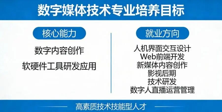 05就业前景数字媒体技术专业是“就业绿牌”专业,毕业生在就业市场上具有广泛的就业前景。他们可以在互联网公司、新媒体营销公司、短视频制作公司、数字人直播公司、影视公司、动画公司、游戏开发公司等领域从事网页交互设计、网页前端开发、新媒体内容创作、影视后期、技术研发、运营管理等工作,逐步成长为数字媒体技术领域的专家。黑龙江工程学院昆仑旅游学院数字媒体技术专业以“新媒体、网页交互、影视”为核心,致力于培养掌握数字媒体技术的基本理论、新媒体技术、网页技术、虚拟现实影像制作与影视后期制作,并具备较高综合素养及创新精神的数字媒体技术人才。毕业生经过工作岗位上5年的发展,可逐步向高级网页交互设计师、新媒体运营专家、影视后期技术总监、数字人直播经理和互联网营销创意总监等较高层次专业技术和团队管理岗位发展,成为技术和管理复合型数字媒体技术人员。