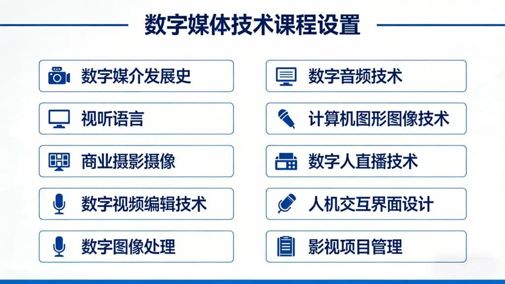 03课程设置数字媒介发展史、视听语言、商业摄影摄像、数字视频编辑技术、数字图像处理、数字音频技术、计算机图形图像技术、数字人直播技术、人机交互界面设计、影视项目管理等课程。
