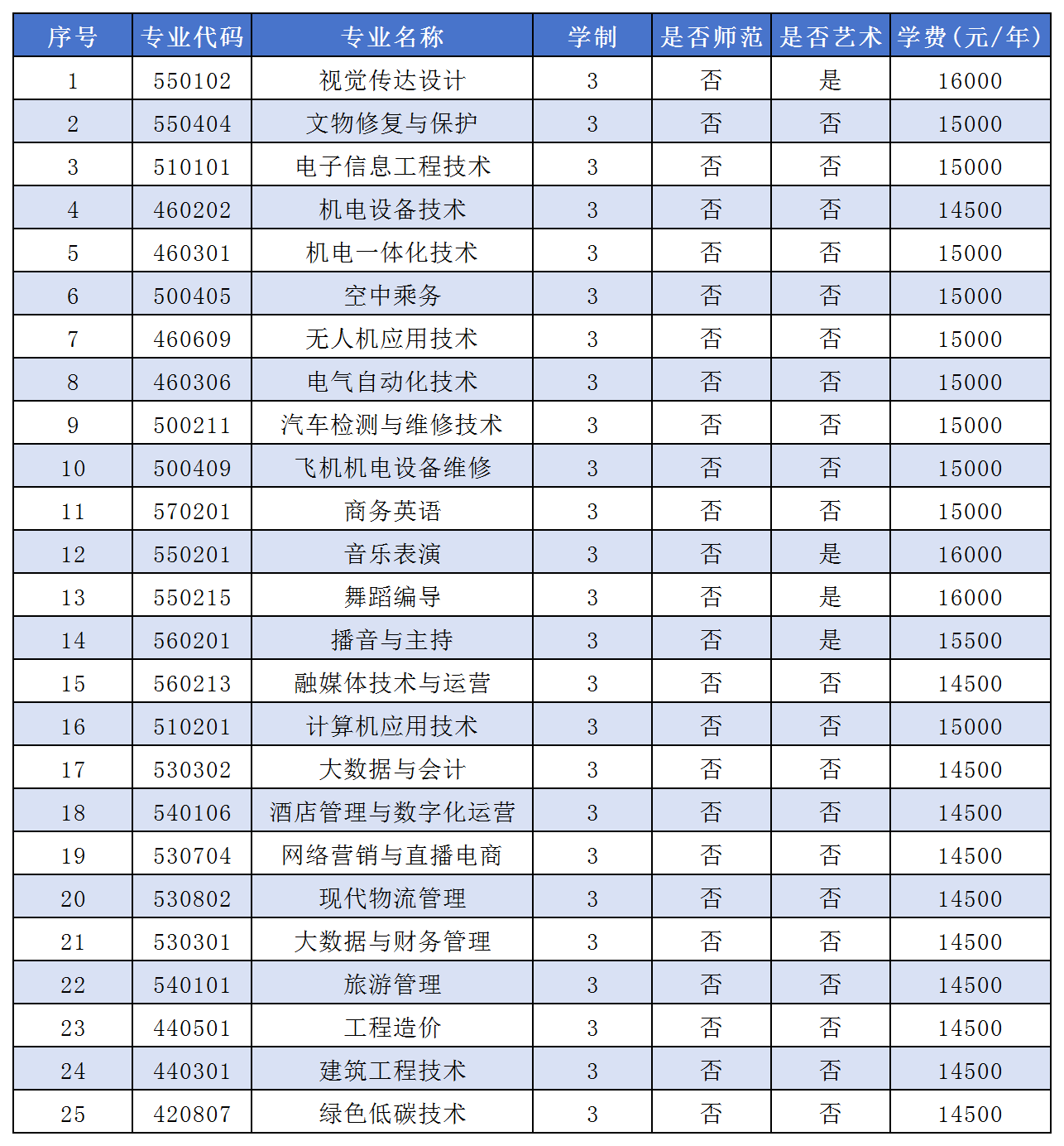高职单招专业有视觉传达设计、文物修复与保护、电子信息工程技术、机电设备技术、机电一体化技术、空中乘务、无人机应用技术、电气自动化技术、汽车检测与维修技术、飞机机电设备维修、商务英语、音乐表演、舞蹈编导、播音与主持、融媒体技术与运营、计算机应用技术、大数据与会计、酒店管理与数字化运营、网络营销与直播电商、现代物流管理、大数据与财务管理、旅游管理、工程造价、建筑工程技术、绿色低碳技术。