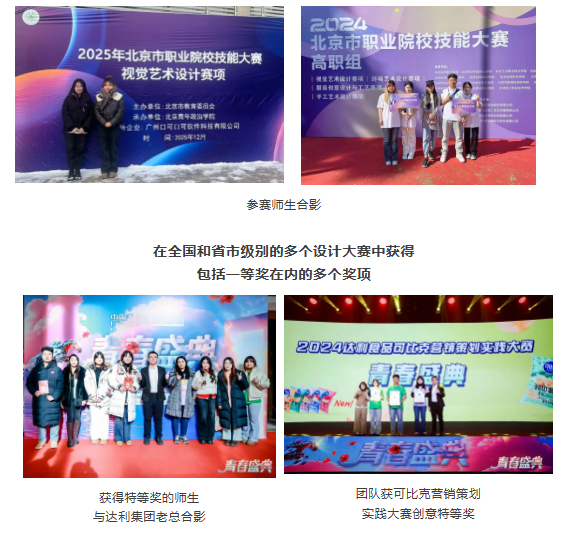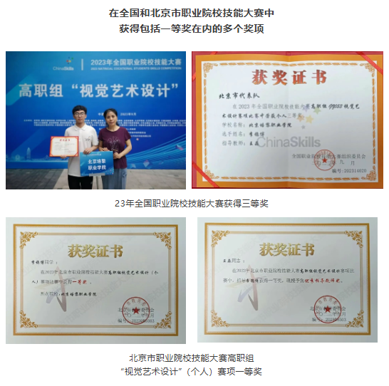 在实践教学中以视觉传达设计实训室和工作室的形式开展丰富的教学内容,学生完成的各类设计作品通过参加北京国际设计周、服贸会和海淀市集等展览展示活动以及各类设计大赛,得到了社会的认可。本专业近五年学生作品获国家级奖项十余项,省市级奖项几十余项,实践教学成果显著。