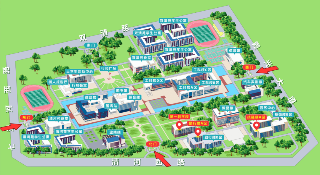 (地图上红色标注为入校大门和考场)