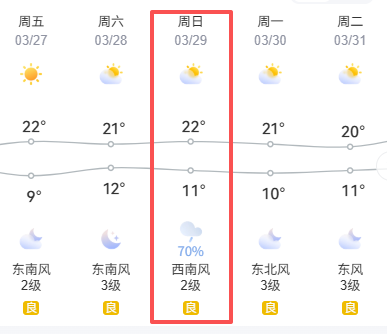 周日阜阳天气晴转多云,气温舒适宜人,最高 22℃,最低 11℃,昼夜温差稍大,早晚记得添件薄外套~