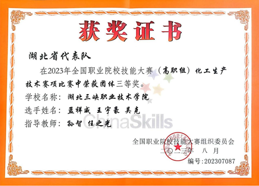 1 | 王宇豪等 | 全国职业院校化工生产技术大赛 | 三等奖 | 全国职业院校技能大赛组织委员会 | 2023 |