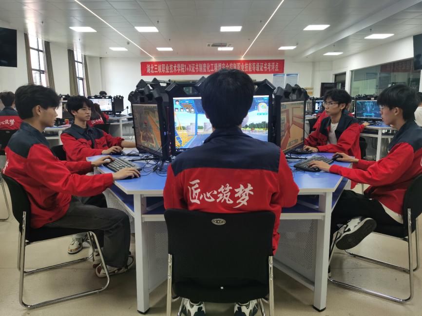 绿色化工虚拟仿真中心:依托数字孪生技术,配置各类3D仿真软件及高性能电脑,共200个工位。可进行化工单元、安全环保、自动控制等全流程虚拟仿真操作,有效破解高危不可及实训难题。