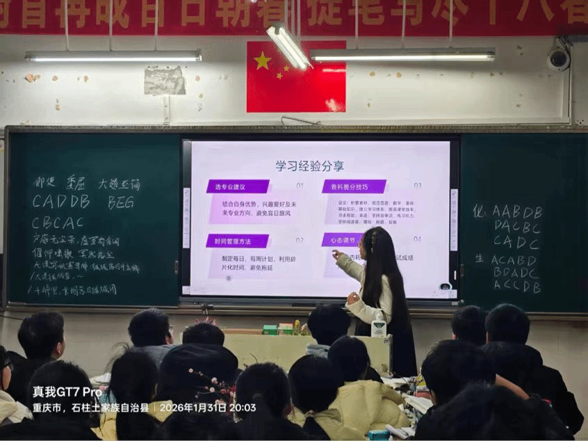 活动当天,我通过PPT展示了丰富多彩的大学生活,从校园环境、专业课程到社团活动,全方位地为他们描绘了大学的模样,激发了他们的学习动力。互动环节,学弟学妹们提问的关于志愿填报、专业就业前景的问题,我耐心地一一解答,结合自身经历给出了真诚的建议。活动最后我将准备好的备考资料赠送给他们,并鼓励他们树立目标、脚踏实地,在高考中取得优异成绩,考入理想的大学。