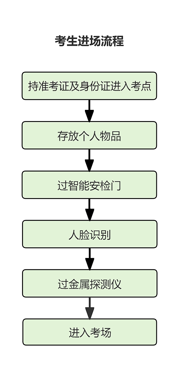 考试当天,请考生规划好出行线路,选择合理出行方式,提前到达考点,留足入场安检、身份验证时间(自驾车请提前了解考点有无停车场地)。进入考点前,考生应自行检查是否携带具有无线通信功能的设备(如手机、无线耳机、智能手表、运动手环、智能眼镜等)、电子存储记忆录放设备、考试相关资料,以及准考证正、反两面是否有涂改、书写字迹;并自觉接受监考员等考试工作人员使用智能安检门、金属探测仪、人脸识别身份验证设备等进行安全检查,不得以任何理由妨碍监考员等考试工作人员履行职责,不得扰乱考场及其他考试场所的秩序。