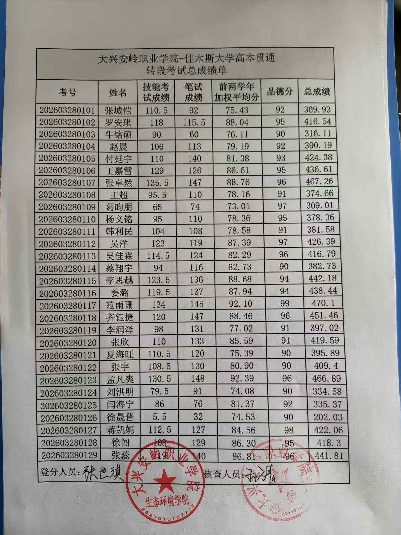 大兴安岭职业学院--佳木斯大学2023级高本贯通转段考试总成绩单