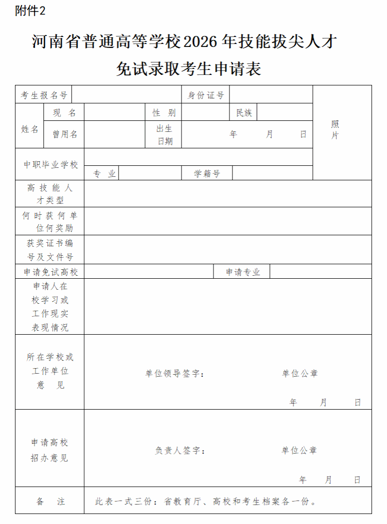 1.考生本人在规定时间内填写《河南省普通高等学校2026年技能拔尖人才免试录取考生申请表》(详见附件2),提出免试入学申请。由生源学校负责确认考生获奖情况。