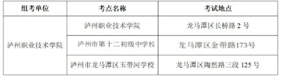泸州职业技术学院考点分设三个分考点(泸州职业技术学院、泸州市第十二初级中学校、泸州市龙马潭区玉带河学校),请考生务必仔细阅读准考证上的信息,避免走错考点或错过考试时间等影响考试。