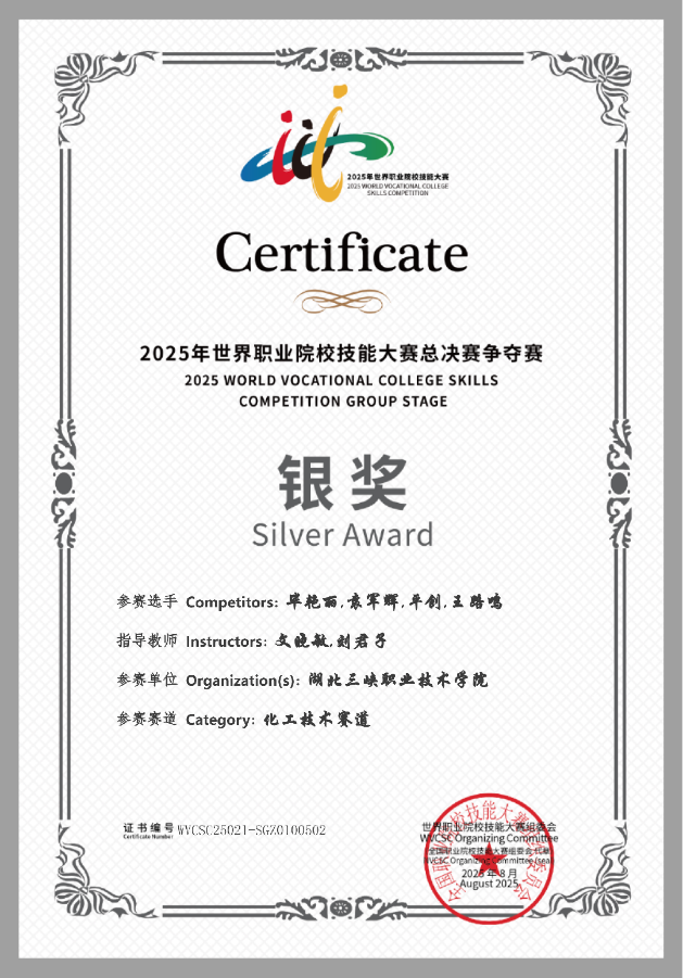 24化工自动化一班 王路鸣 获得世界职业院校技能大赛总决赛银奖