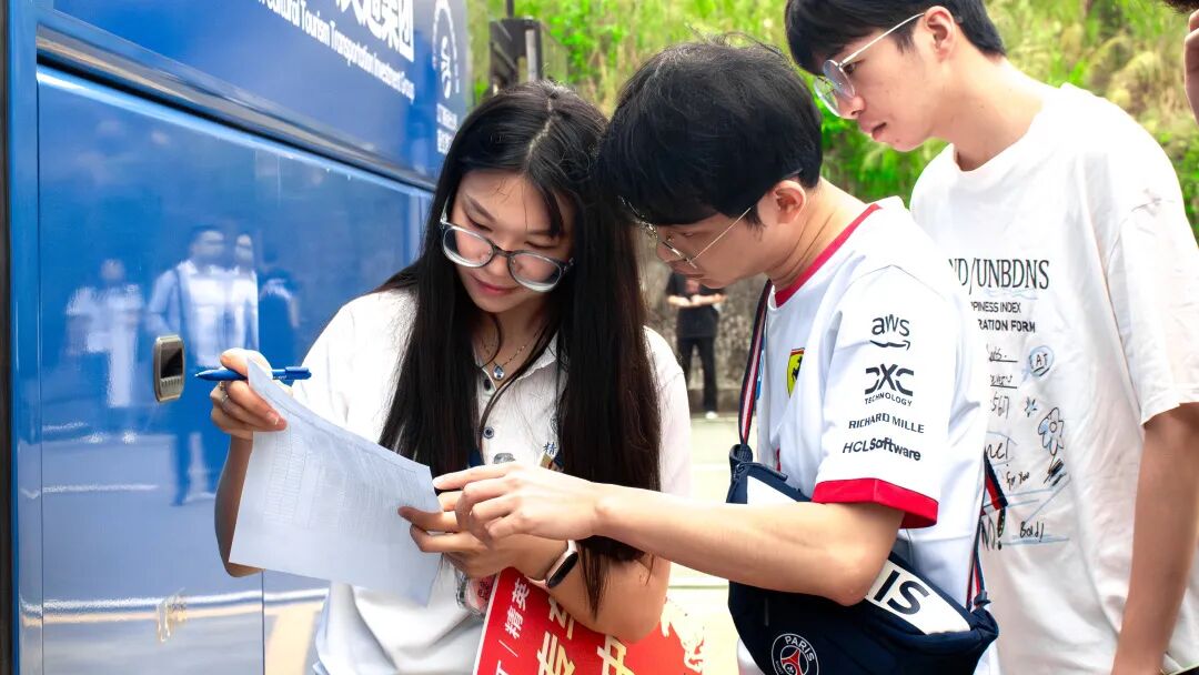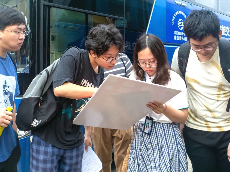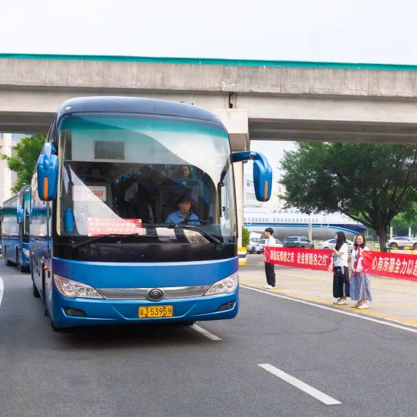 车门前,“送考护航团”的老师们早已列队等候,学子们循着指引标识找到对应车辆,有序排队、依次签到。