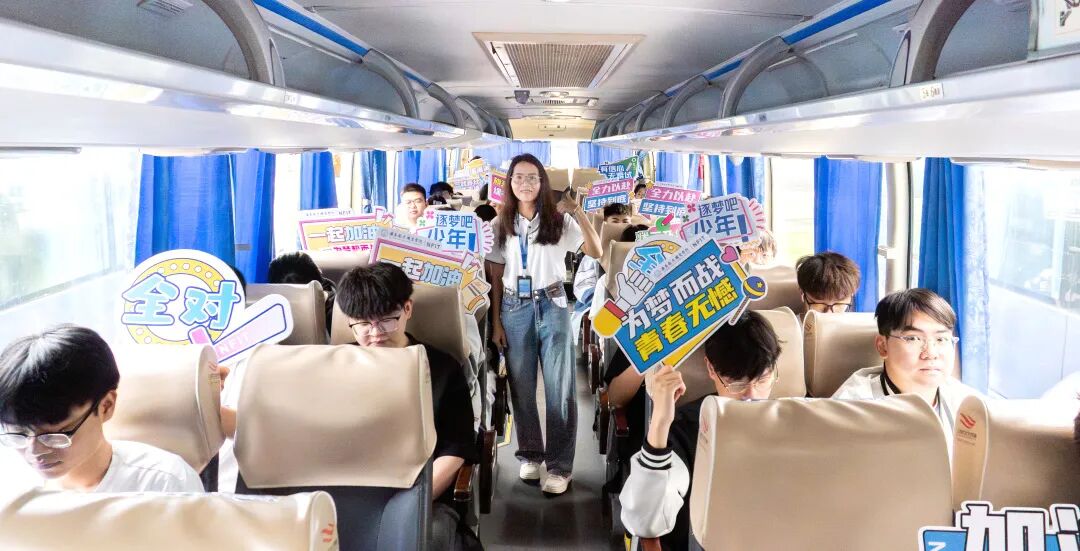 已上车的同学也自发坐直身子,为后续上车的伙伴鼓掌加油,一声声 “加油”“必胜” 的呐喊,让紧张的出征时刻,多了几分热血与温情,也让彼此的信心愈发坚定。