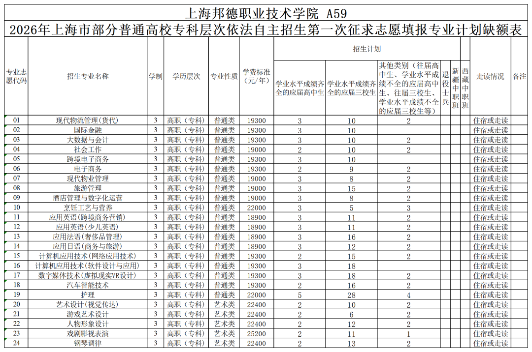 2026年上海市部分普通高校专科层次依法自主招生第一次征求志愿填报专业计划缺额表