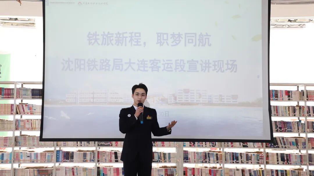 宣讲阶段,大连客运段鲁娜老师通过PPT演示,全面解读企业概况、岗位需求、任职条件、薪资体系及人才发展通道,重点针对同学们关注的就业政策、岗位适配性、晋升路径等热点问题作出权威解答,帮助学子进一步明确就业方向、理清求职思路。宣讲最后,副段长李宏有登台补充发言,详细介绍了大连铁路局及大连客运段的发展概况、行业优势、运营规模及未来发展规划,为同学们描绘了清晰的职业发展蓝图,进一步增强了学子们投身铁路行业的信心。