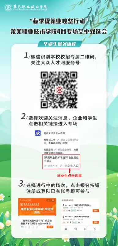 微信报名入口:微信扫描页面下方双选会二维码或微信搜索“大众人才网”关注公众号,企业和毕业生分别点击相关按钮进入莱芜职业技术学院专场,点击报名按钮,注册或登录已有账号即可直接参与。