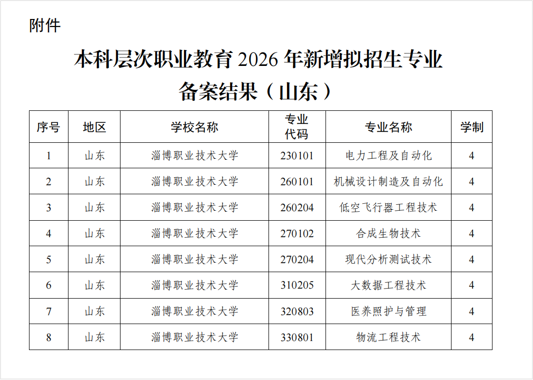 2025年2月,教育部批准以淄博职业学院为基础设立淄博职业技术大学,首批设置电气工程及自动化、汽车工程技术、物联网工程技术、应用化工技术、制药工程技术、建筑工程等6个四年制职业本科专业。至此,学校四年制职业本科招生专业增至14个,专业结构布局进一步优化,服务国家战略和区域产业发展的能力持续增强。