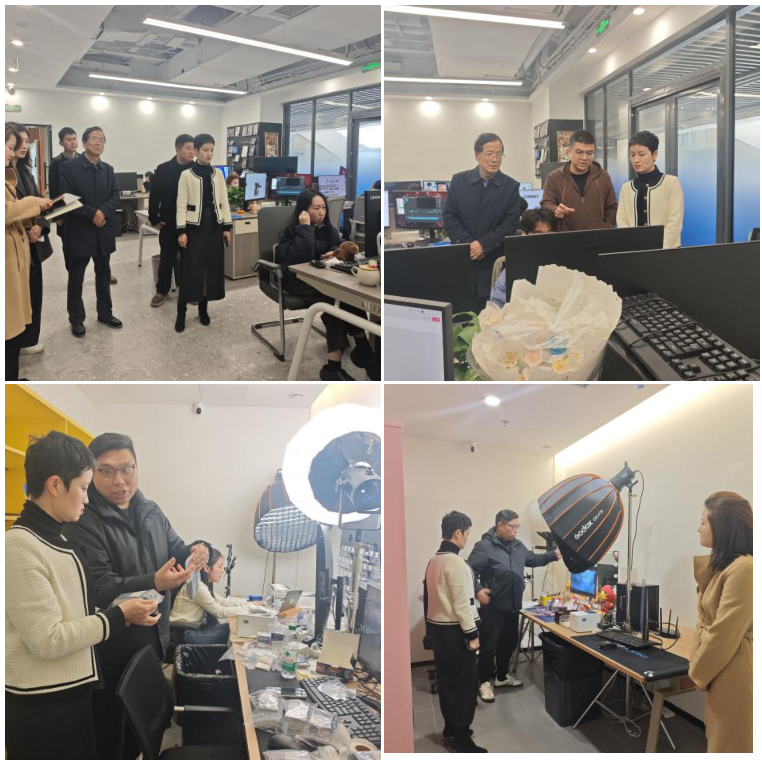 公司校企合作部门负责人热情接待了学院一行人,并全程陪同参观走访。在企业负责人的带领下,学院一行先后参观了公司标准化办公区域、专业直播间、AI短剧制作办公区、内容策划工作室及后期剪辑中心等核心场地,近距离了解了数字传媒行业的运营模式、AI短剧创作全流程、新媒体直播运营规范及行业前沿技术应用。