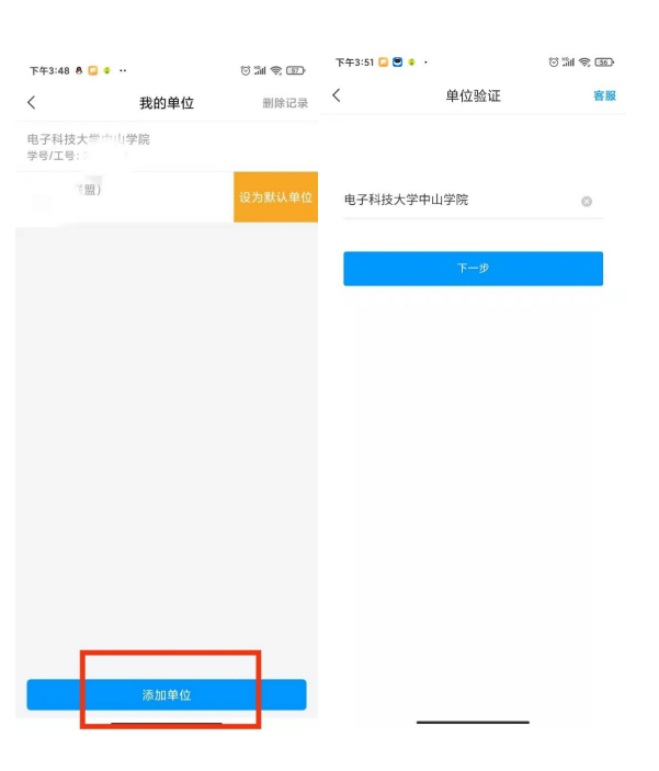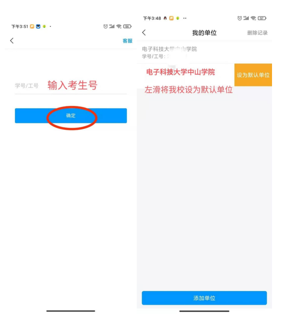 添加单位——输入电子科技大学中山学院——填写考生号,在我的单位界面“电子科技大学中山学院”栏目,左滑“设置默认单位”