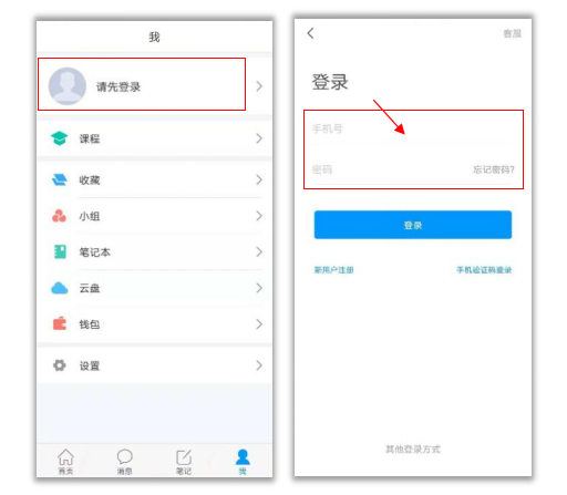 打开学习通,点击“我”——“请先登录”——直接输入手机号与密码进行登录。