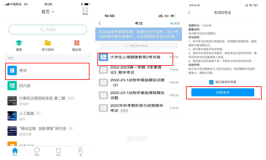 收到学校的考试通知后,首页点击”考试”,进入考试列表,选择对应的进行考试