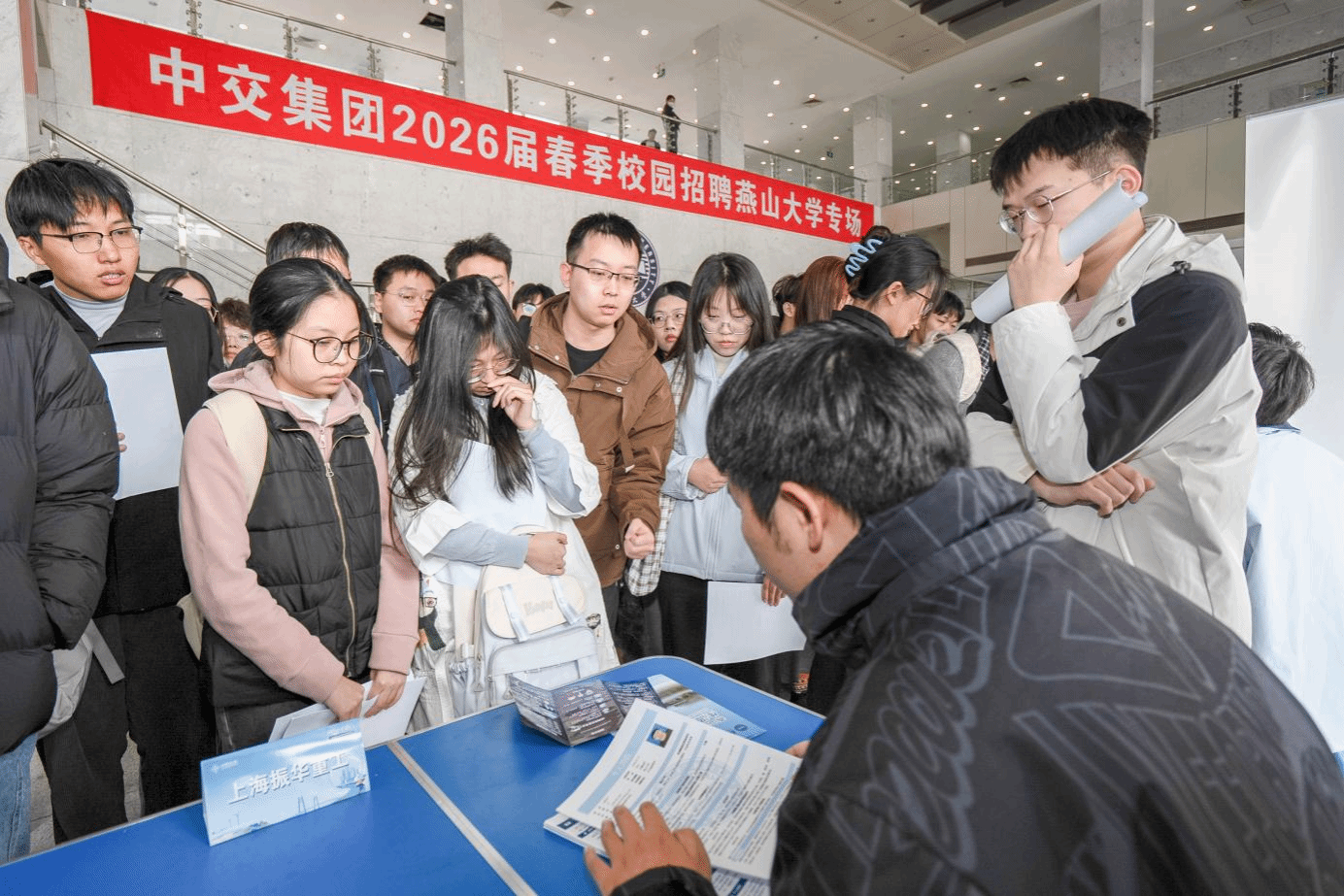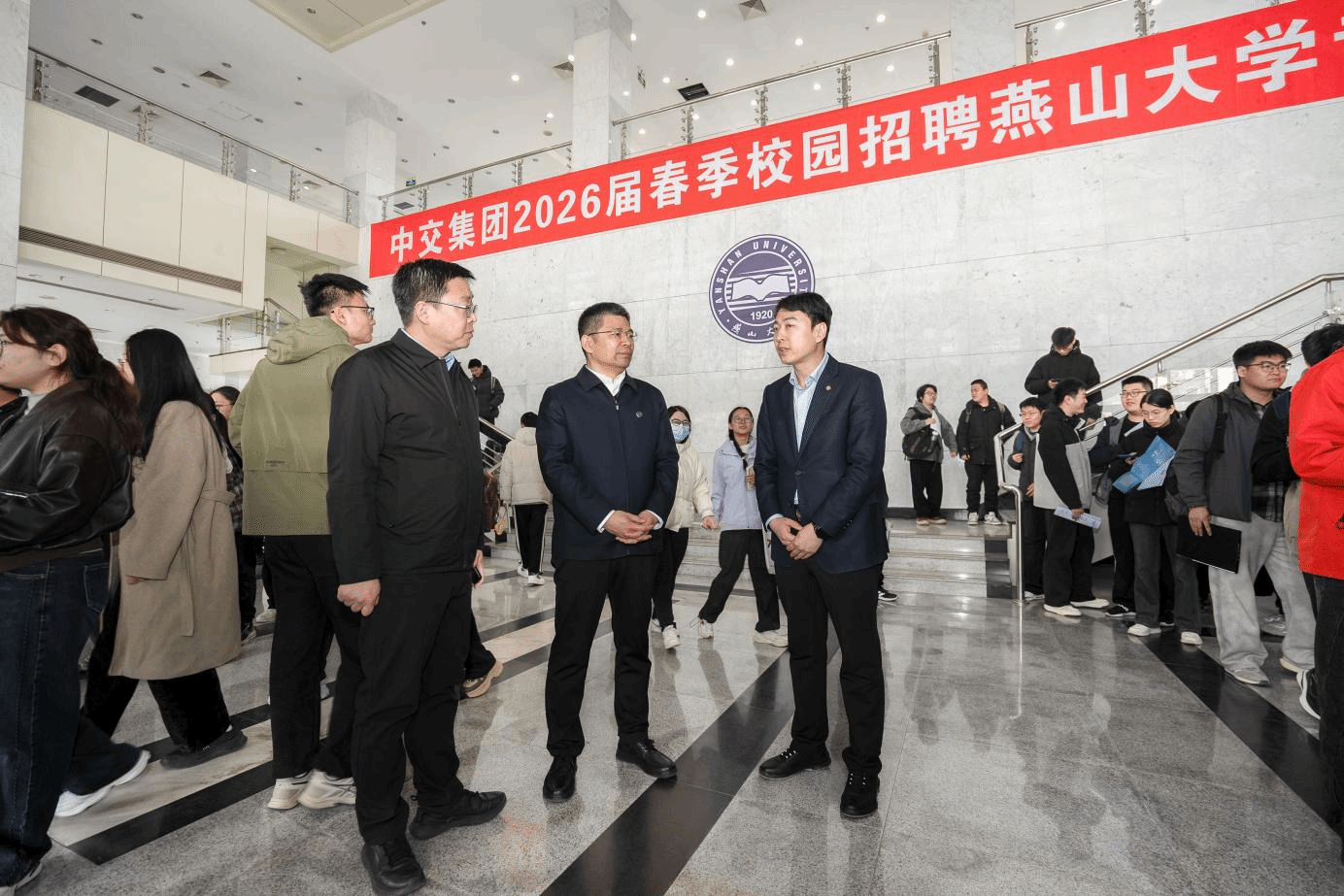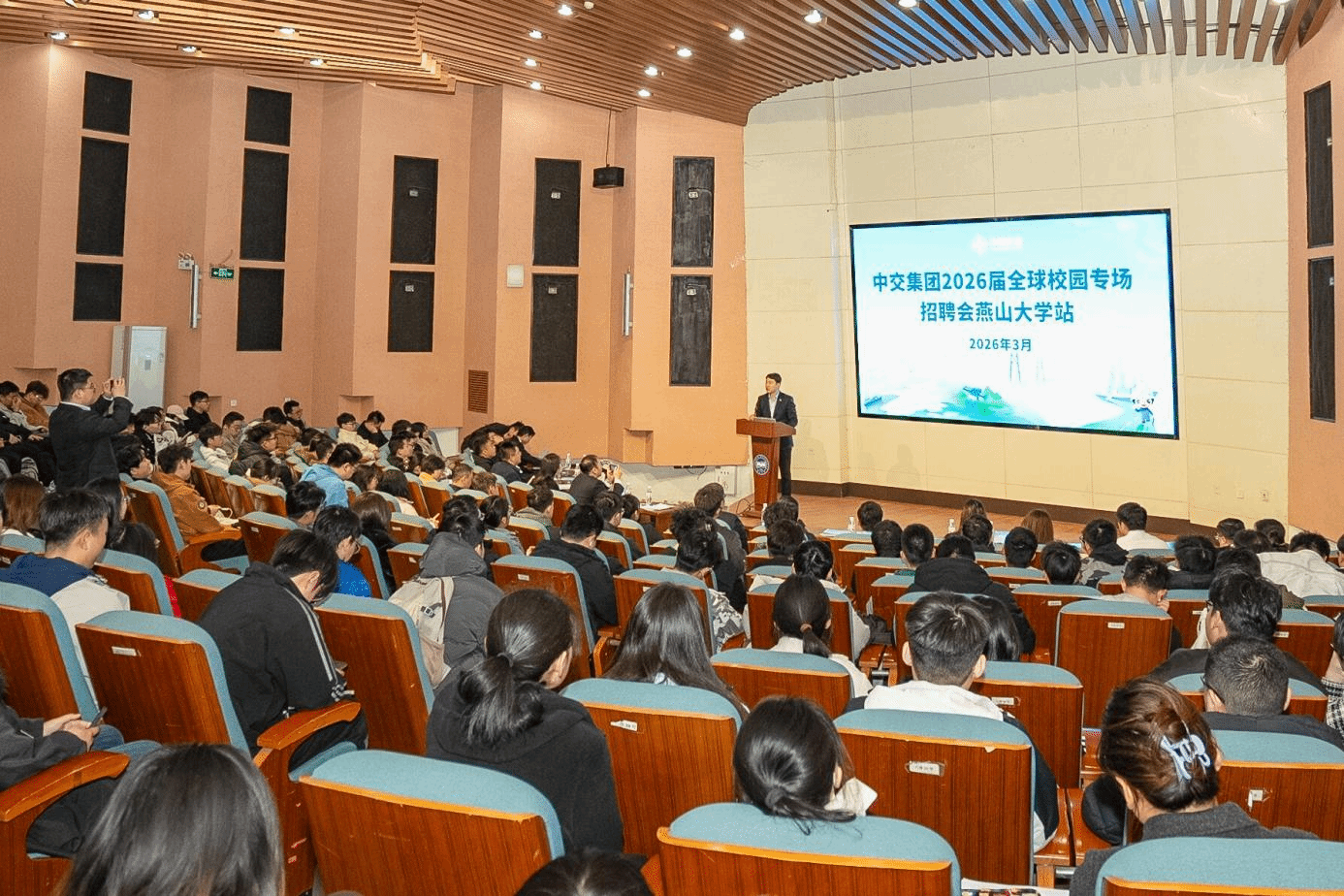 王跃华在致辞中对中交集团表示欢迎与感谢。他表示,学校工科底蕴深厚,在机械、材料、电气等领域科研实力雄厚,学科优势与中交集团产业布局、人才需求高度契合。双方此前在港口机械、海工装备等领域合作成效显著,百余名燕大毕业生在中交集团建功立业。同时,鼓励燕大学子主动走出校园,深入中交集团的工程项目一线去实习、去历练,在实践中增长才干。企业宣讲环节,中交集团六家成员单位依次登台,结合各自发展布局、核心业务特色,详细介绍人才培养体系、薪酬福利政策及具体岗位需求,让毕业生清晰了解招聘核心信息。