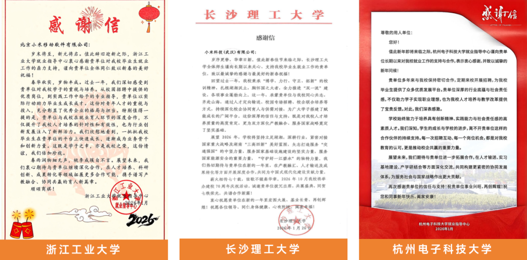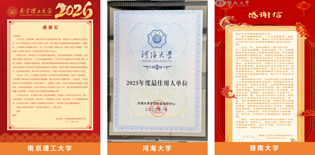 高校感谢信小米集团高校关系陆续收到来自上海交通大学、天津大学等多所顶尖高校致送的感谢信及合作荣誉奖牌。这既是对小米校企合作工作的高度认可,也充分彰显了双方在人才培养、技术共研、生态共建等领域合作成果持续深化、合作关系日益稳固。