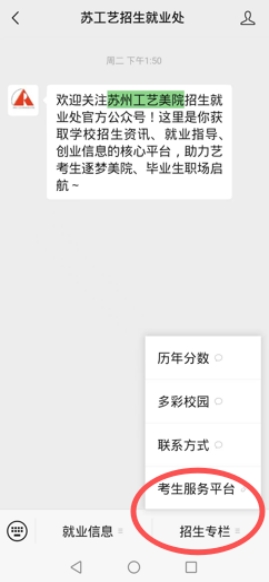 2、进入公众号后,点击下方招生专栏的“考生服务平台”菜单,如下图: