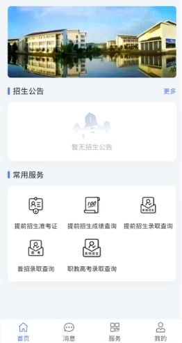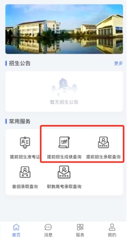 5、点击上图的"首页"按钮回到主页,在"常用服务"里点击"提前招生成绩查询或提前招生录取查询",如下图所示: