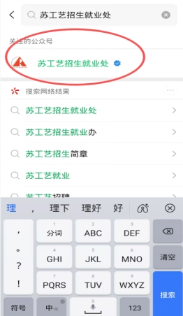 1、使用手机打开微信搜索“苏工艺招生就业处”,关注公众号(已关注公众号的考生只需搜索并进入公众号)。