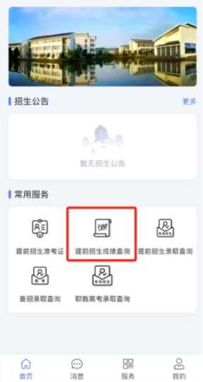5、点击上图的"首页"按钮回到主页,在"常用服务"里点击"提前招生成绩查询",进入准考证下载页面,如下图所示: