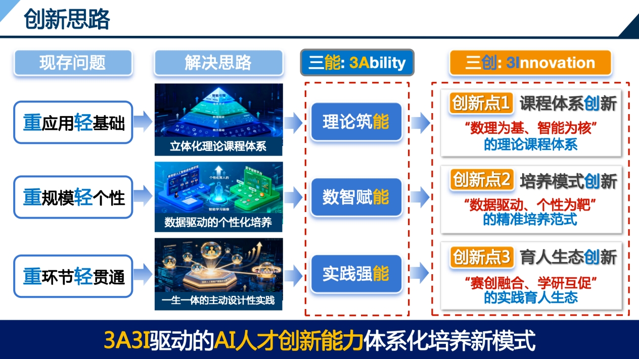 3A3I驱动的AI人才创新能力体系化培养与实践(第一完成人:许文俊教授)入选2025年度CAAI教学成果激励计划一类成果。在全球AI竞争白热化、国家亟需突破“卡脖子”技术原始创新人才的背景下,针对当前AI教育中“重应用轻基础、重规模轻个性、重环节轻贯通”三大核心矛盾,本成果以“服务国家科技自立自强”为导向,系统构建“3A3I”AI人才培养新模式。该模式以“能力(Ability)筑基”与“创新(Innovation)引领”双向融合为理念,形成“能创融合、三维一体”的创新框架。在“三能”贯通体系方面,理论筑能层创立“数理为基、智能为核”的贯通式课程体系,夯实学生学科基础;数智赋能层创立“数据驱动、个性为靶”的精准培养范式,实现因材施教;实践强能层创立“赛创融合、学研互促”的协同共育生态,强化创新能力。在“三创”协同路径方面,通过课程体系创新、培养模式创新、育人生态创新的有机联动,实现规模教育与个性培养的统一、基础夯实与创新实践的结合。目前,该成果已在北京邮电大学全面落地实施,并面向全国12省推广应用,显著提升了AI教育的整体质量与竞争力。