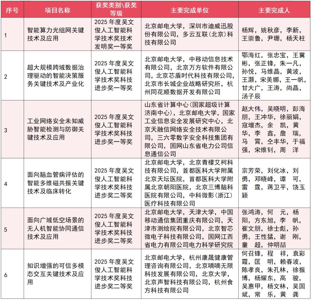 近日,2026年吴文俊人工智能创新大会第十五届吴文俊人工智能科学技术奖颁奖典礼在常州举行,我校6项科技成果荣获2025年度吴文俊人工智能科学技术奖,其中,一等奖3项、二等奖3项。