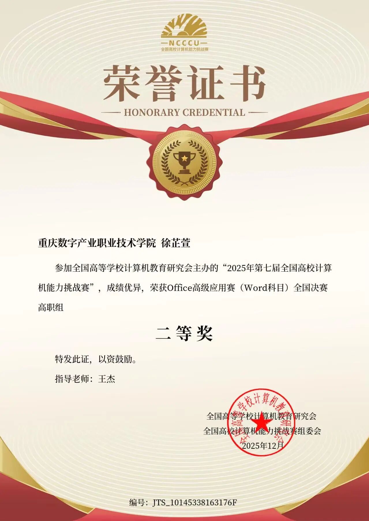 全国高等学校计算机教育研究会、全国国高校计算机能力挑战赛组委会发布《关于举办2025年第七届全国高校计算机能力挑战赛的通知》。在这次比赛中,学院学子表现出色,一名同学荣获Office高级应用赛去(Word科目)全国决赛高职组二等奖。