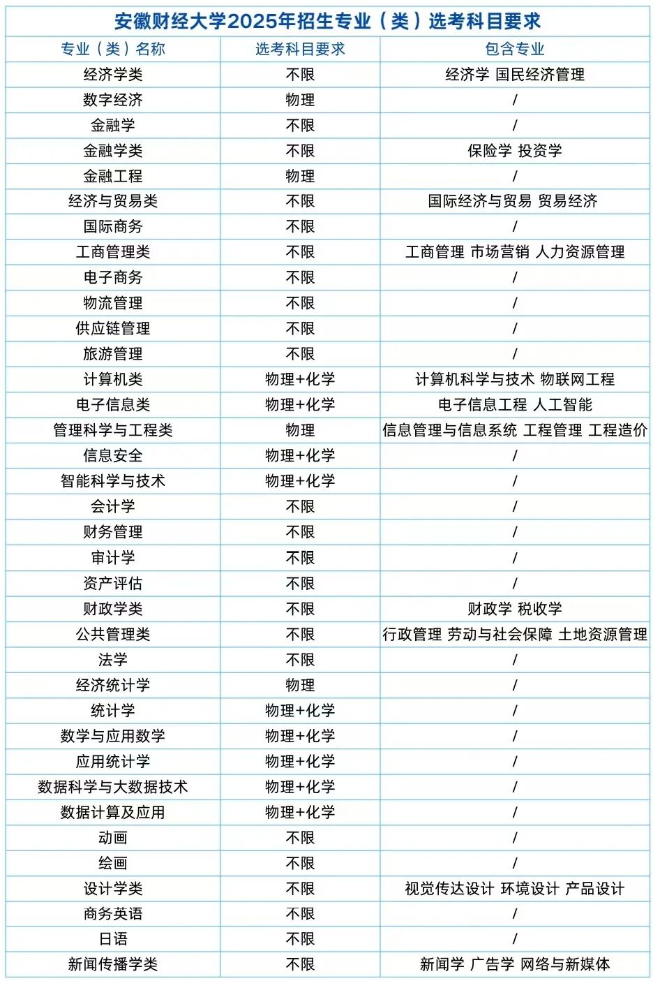 为方便广大考生、家长直观了解安徽财经大学2025年各招生专业(类)选考科目要求,现将相关信息公布如下。