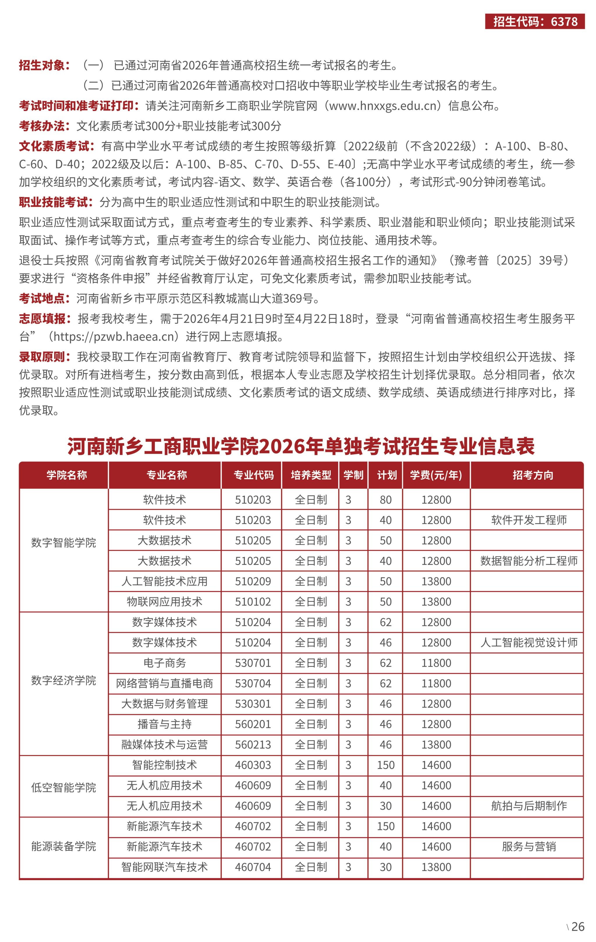 河南新乡工商职业学院2026年单独考试招生简章